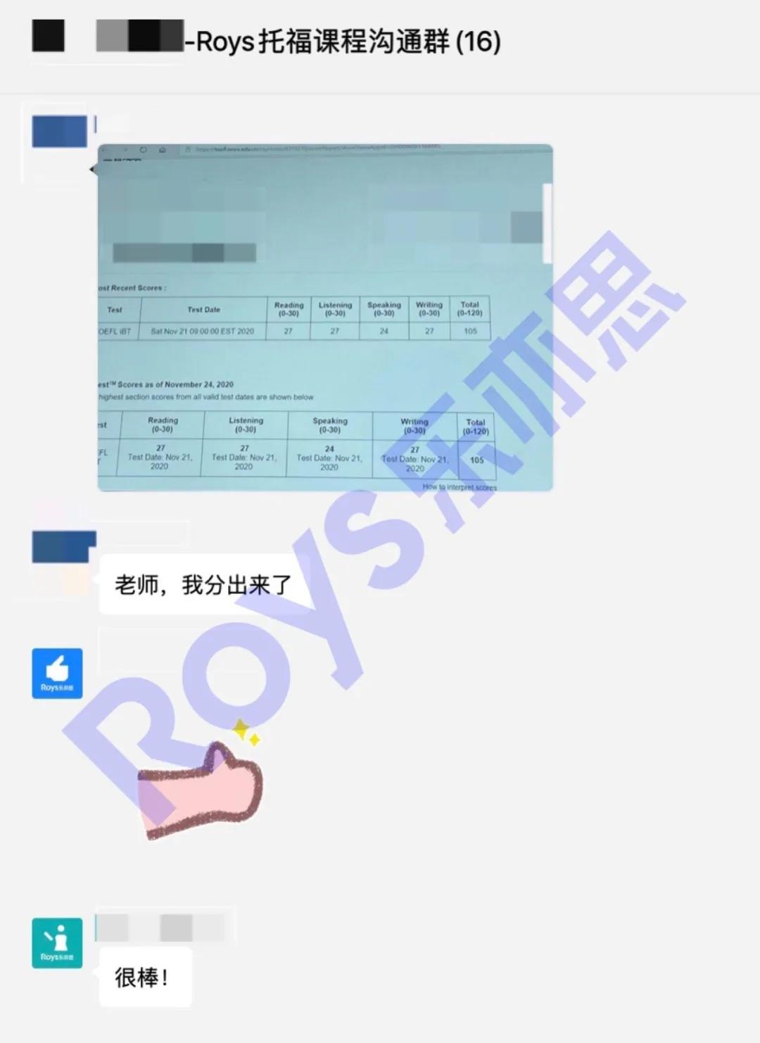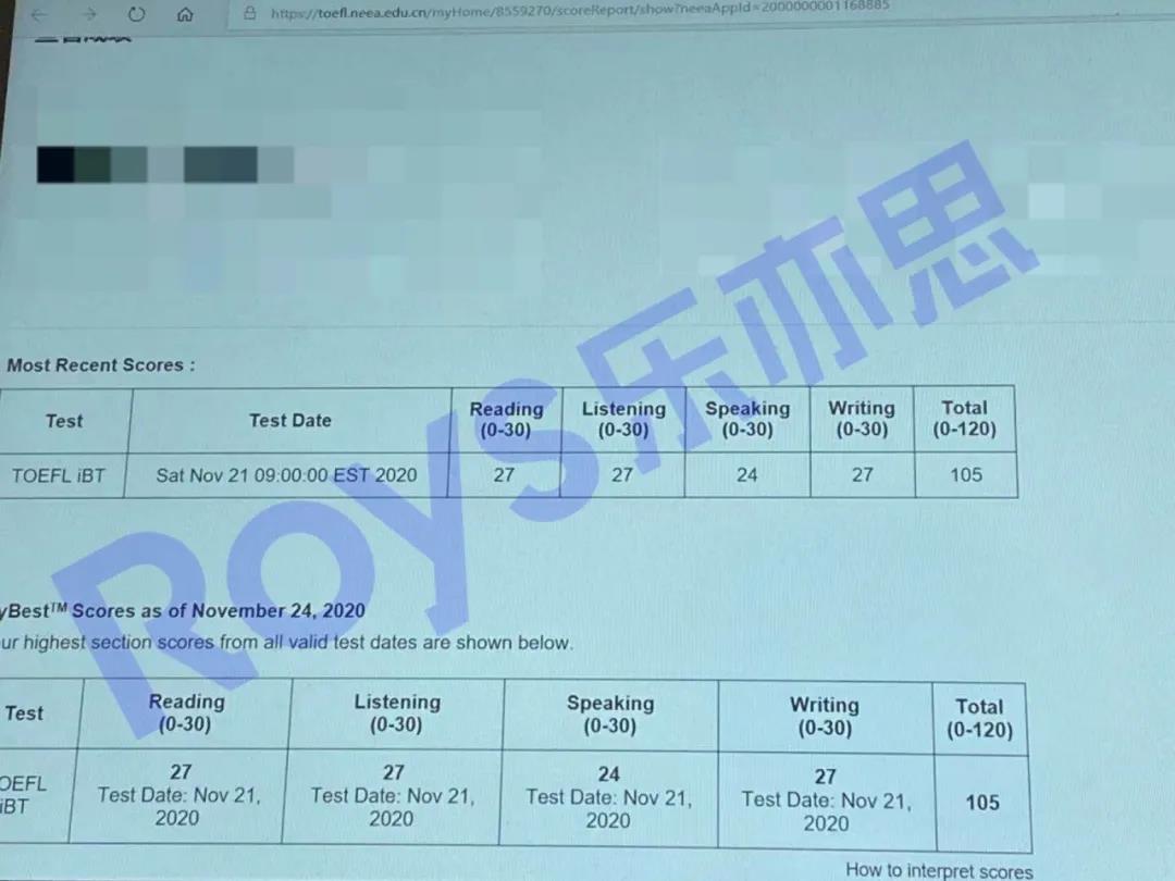 Roys樂亦思托福課程學(xué)員實(shí)現(xiàn)96到105的跨越