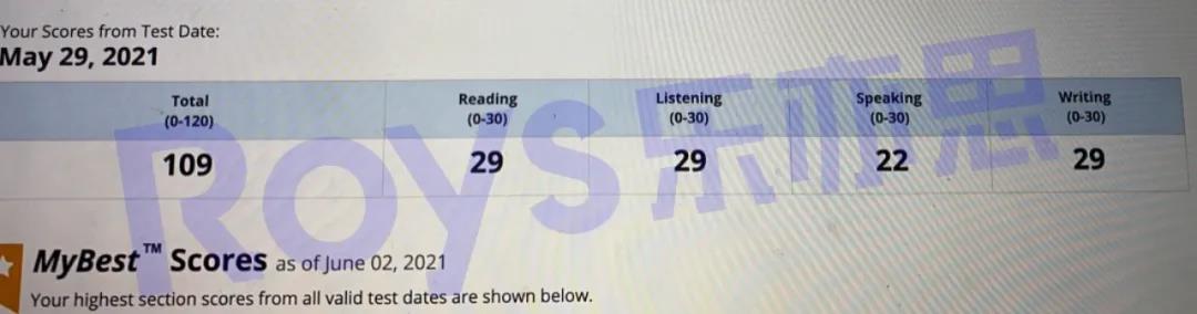 Roys樂亦思托福課程學(xué)員培訓(xùn)6天從105進步到109