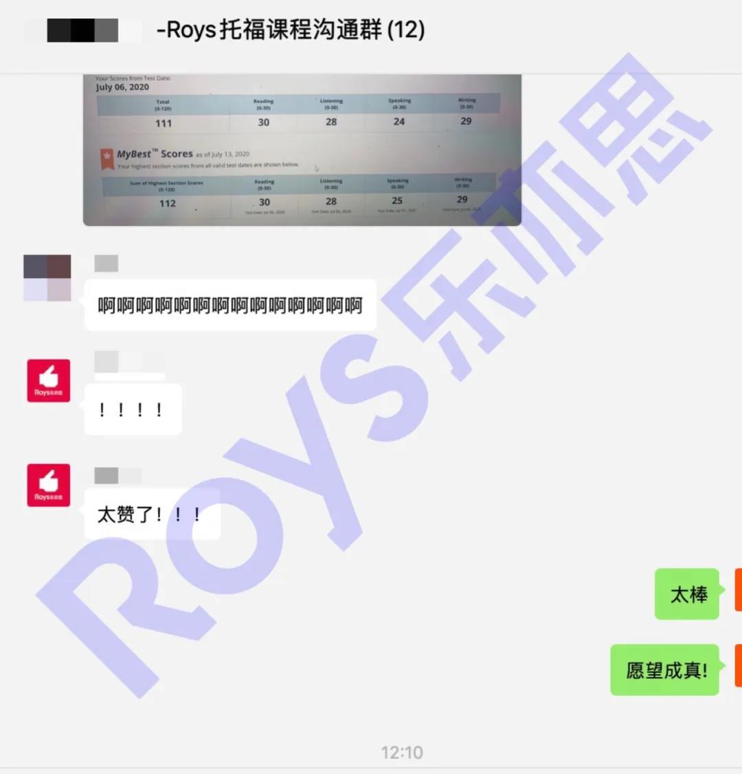 陳同學(xué)積極參與Roys樂亦思的托福融合班課和老師的持續(xù)作業(yè)跟進(jìn)后,12天培訓(xùn)終于圓夢(mèng)110+。