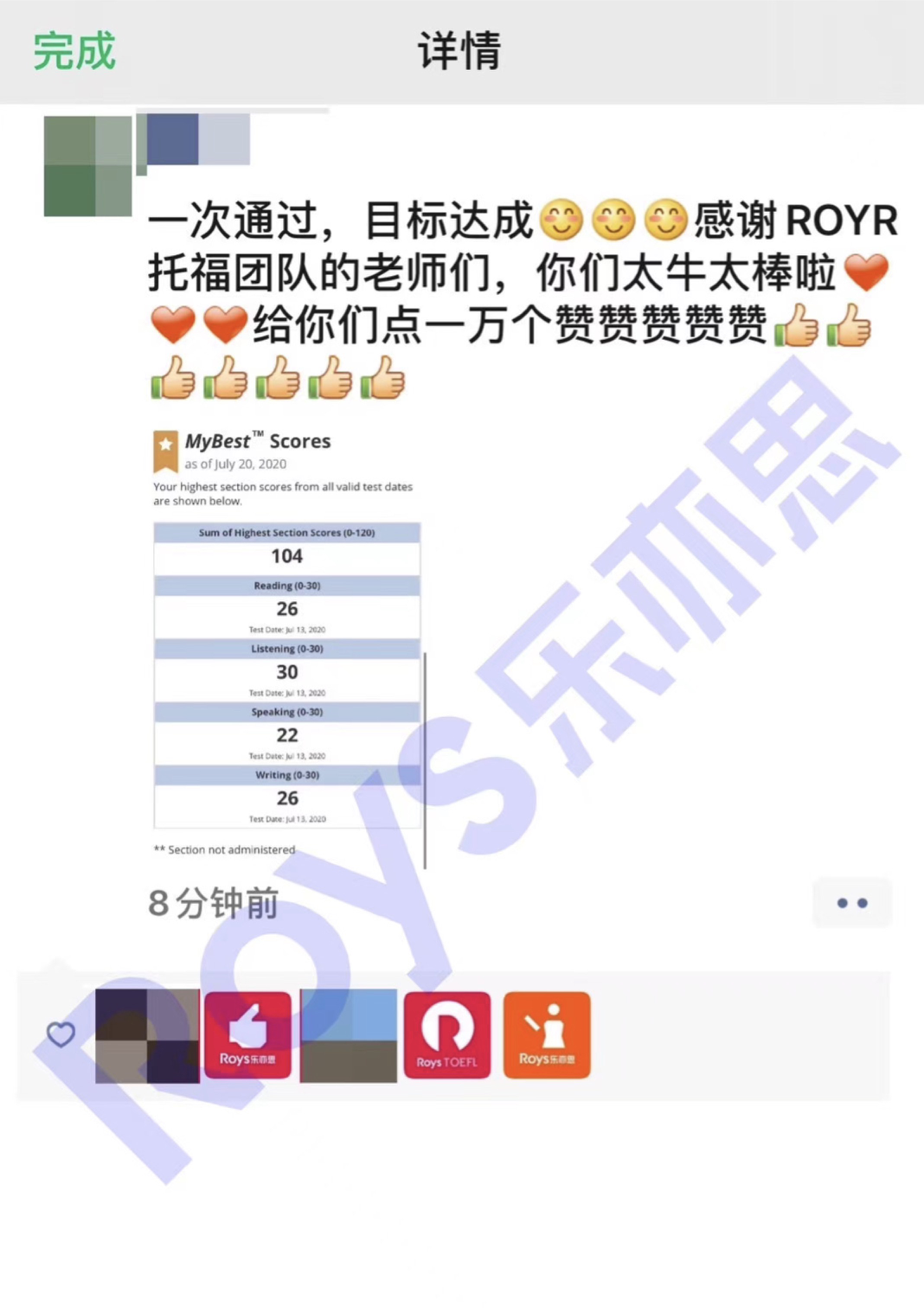 沈同學(xué)參加樂亦思托福融合班課+一對(duì)一專項(xiàng)提升,單次提分23分,取得104的好分?jǐn)?shù),目標(biāo)達(dá)成