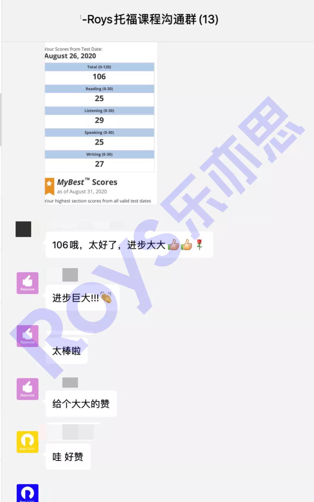 R同學(xué)經(jīng)過(guò)Roys樂(lè)亦思短期的集訓(xùn)突破瓶頸 ,總分取得106的好成績(jī)
