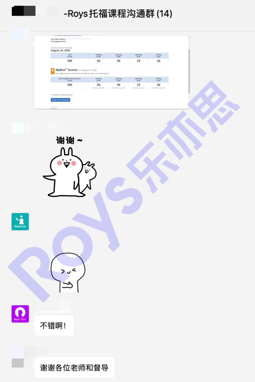 X同學通過Roys樂亦思托福融合班課和一對一集訓,首考取得105的好成績,聽力滿分