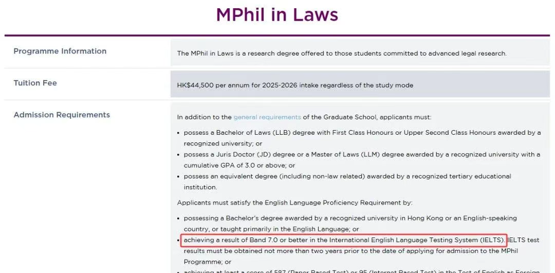 就比如說(shuō),以前港大法學(xué)院的MCL項(xiàng)目,語(yǔ)言要求比LLM項(xiàng)目要低一些,但從今年開始,它就跟港大的其他LLM項(xiàng)目看齊了,雅思要求提到了7分(各單項(xiàng)都不能低于6.5),托福也要97分了。