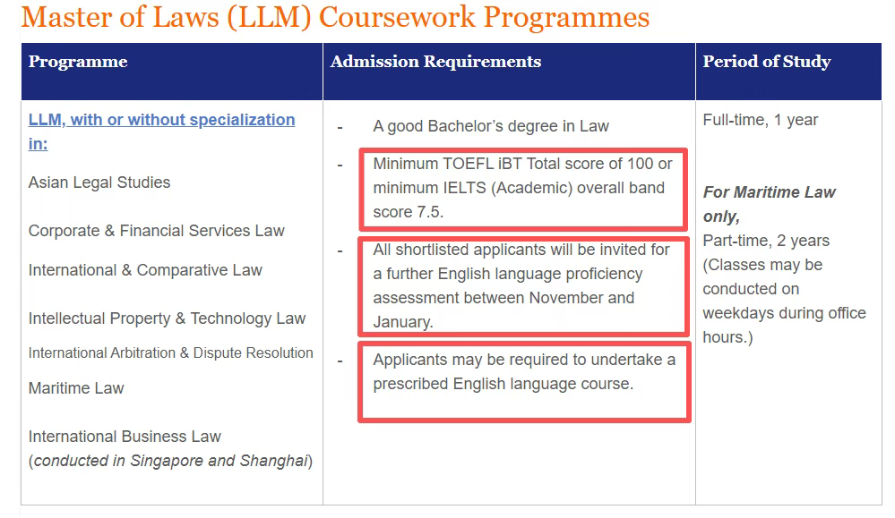 近年來(lái),不少院校都在悄悄提升雅思成績(jī)的要求。比如,新加坡國(guó)立大學(xué)在申請(qǐng)時(shí)宣布,法學(xué)院LLM項(xiàng)目的雅思要求從7.0提升到了7.5,而且入圍者還需參加進(jìn)一步的語(yǔ)言能力評(píng)估。涉及的專業(yè)包括亞洲法律研究、公司與金融服務(wù)法、國(guó)際法等多個(gè)主流方向。