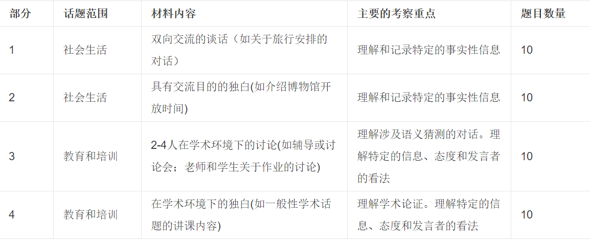 聽力總共有4大題,40小題,雅思聽力題型包括配對(duì),真假,填充,多選,完成句子,標(biāo)簽,選圖表,簡(jiǎn)答”等。其考試時(shí)長(zhǎng)為40分鐘(10分鐘譽(yù)寫答案)。通常會(huì)放4段獨(dú)白和對(duì)話,每段聽力材料只放一次(所以要邊聽邊做),對(duì)應(yīng)10道問(wèn)題,問(wèn)題的排列順序和答案在聽力材料中出現(xiàn)的順序一致。