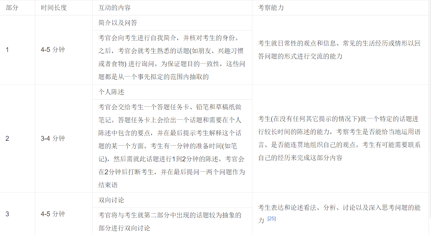 口語(yǔ)考試時(shí)長(zhǎng)很短,為11-14分鐘,雅思考試口語(yǔ)是人考,與考官進(jìn)行一對(duì)一交流的形式以考察考生的英語(yǔ)口語(yǔ)水平,是目前最接近真實(shí)生活場(chǎng)景的互動(dòng)式測(cè)評(píng)。
