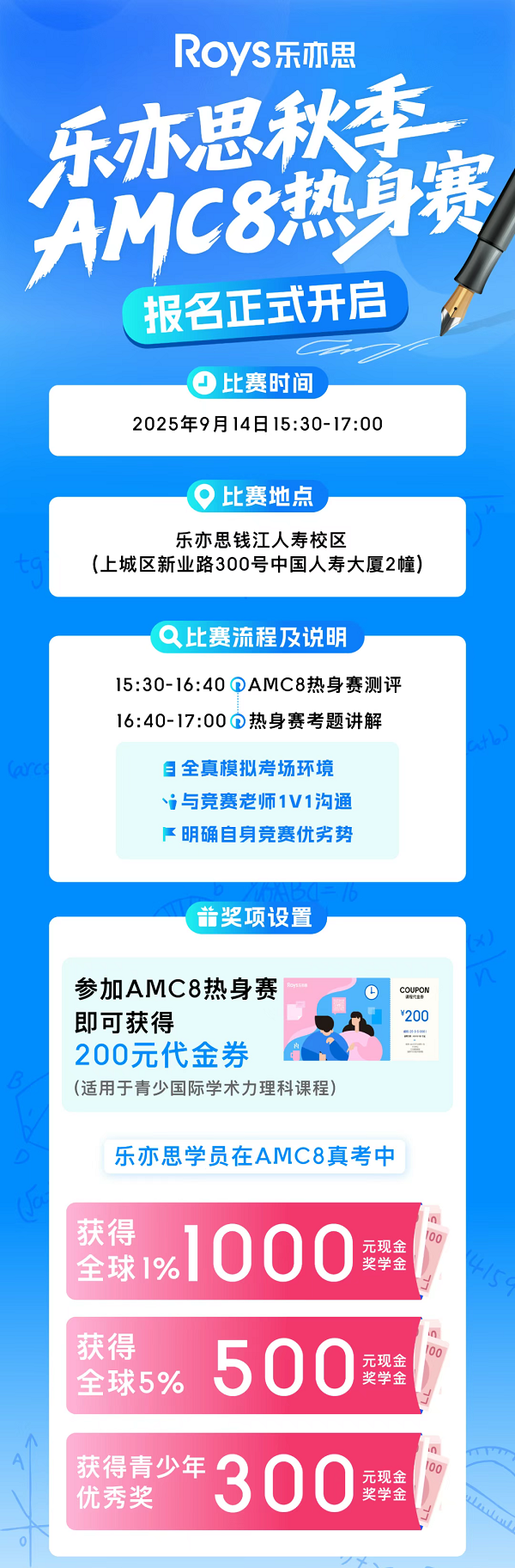 家有備考AMC8競賽孩子的家長們注意啦!樂亦思秋季精心籌備的AMC8熱身賽,正帶著滿滿的誠意與助力,向孩子們大步走來,為備考之路強勢賦能!