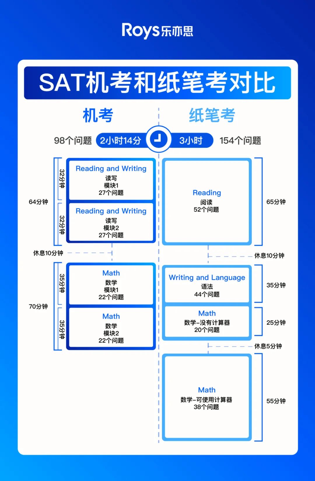 機考采取自適應形式, 學生在Module 1的表現是否出色, 決定了Module 2中題目的難度, 進而決定了分數的上限。學生使用自己的電腦到考點進行考試, 對設備更熟悉。機考和紙筆考的流程對比如下圖: