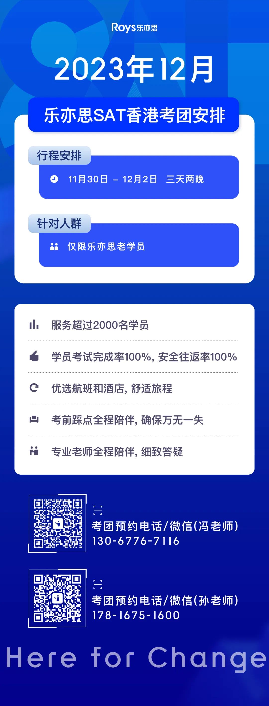 快來(lái)報(bào)名樂(lè)亦思的12月SAT香港考團(tuán)吧!如果你對(duì)SAT考試還有問(wèn)題,或者想要報(bào)名樂(lè)亦思的SAT課程,歡迎咨詢樂(lè)亦思的在線客服哦!