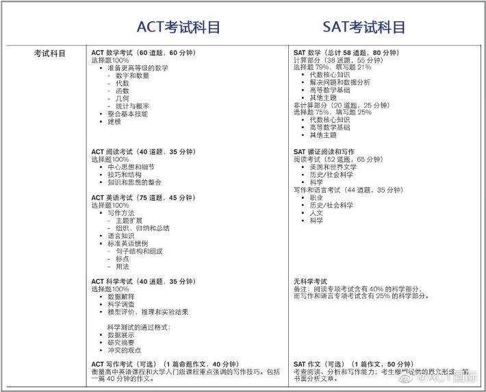 首先需要明確的一點是,被稱為“美國高考”的ACT和SAT,是美國大學申請的基本條件,不存在純粹的簡單難易之分,只是考試的科目內容,側重點各有不同,具體區(qū)別見下表: