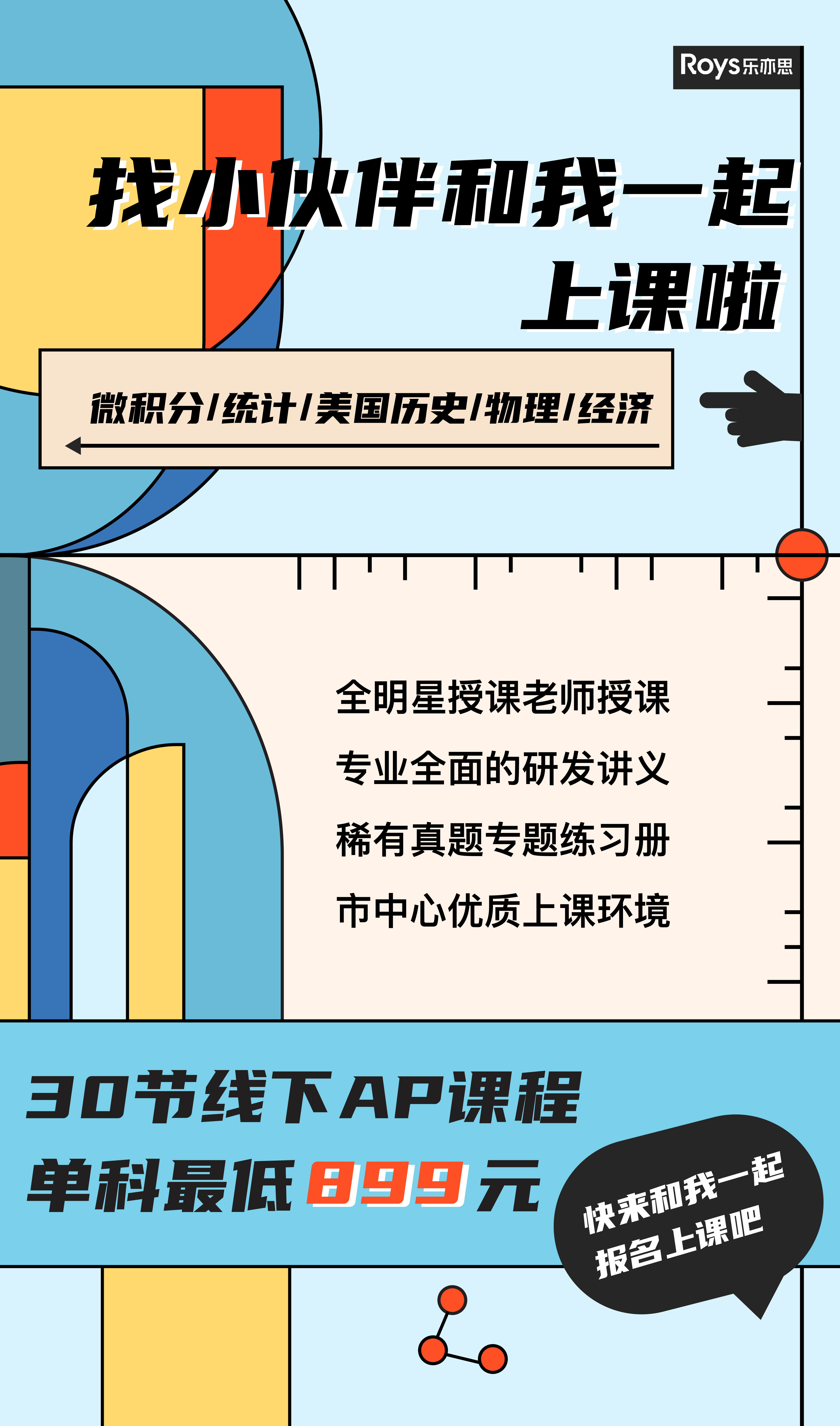AP學(xué)習(xí)難度不是很大,但是也需要用心安排,建議同學(xué)們盡早開(kāi)展AP課程學(xué)習(xí),如果可以更多利用碎片化時(shí)間消化知識(shí)點(diǎn),將更有利于整體的申請(qǐng)備戰(zhàn)。為了幫助更多有出國(guó)留學(xué)考試培訓(xùn)需求的同學(xué)們完成AP的備考,除了Roys樂(lè)亦思常規(guī)的AP全程班和一對(duì)一,我們還在年末推出了一個(gè)超低價(jià)線下AP突破班,希望給大家一個(gè)福利!30節(jié)線下課程,原價(jià)6000,現(xiàn)在報(bào)名只需要899哦!快喊上你的朋友來(lái)參加啦!詳情可以在線聯(lián)系Roys樂(lè)亦思客服。