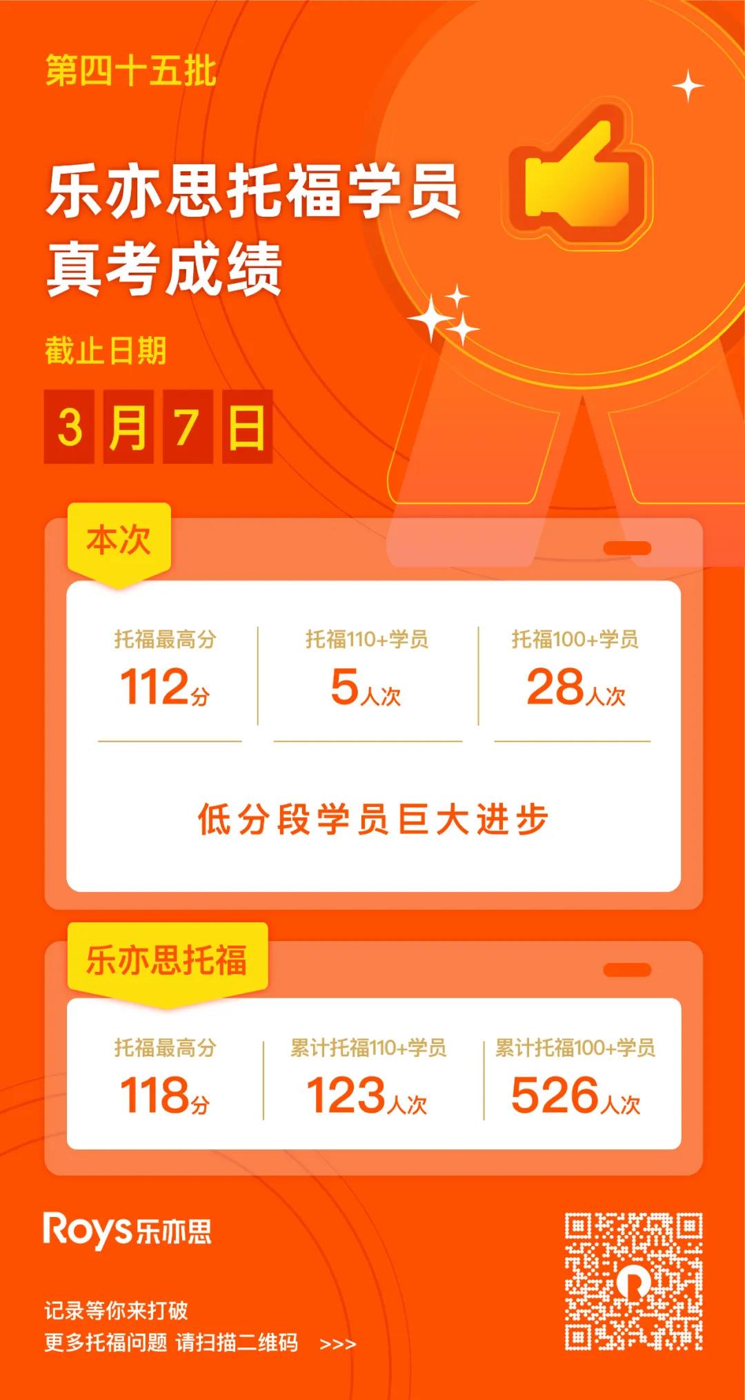 截止2021年3月7日,Roys樂(lè)亦思已幫助123名學(xué)員實(shí)現(xiàn)110+的目標(biāo),526人拿下100+的好成績(jī)。需要免費(fèi)托福測(cè)試的同學(xué)快來(lái)聯(lián)系我們進(jìn)行托福免費(fèi)模擬測(cè)試吧!下一個(gè)110+就是你!