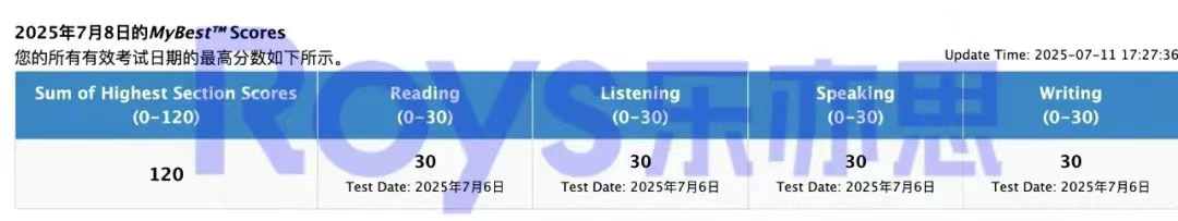 在本批成績中,有6名學(xué)員取得了110分以上的佳績。其中,12年級的L同學(xué)表現(xiàn)尤為搶眼。他在10年級暑假加入樂亦思,僅通過5天的一對一輔導(dǎo),就從102分躍升至118分。今年暑期,他再次沖刺,考前一周集中輔導(dǎo)2天,便從118分一舉拿下滿分120分!總共僅用7天,就提高了18分,實(shí)現(xiàn)了全科滿分的壯舉!