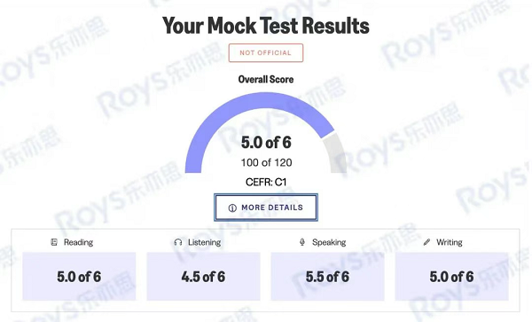 總分則從三個(gè)維度來(lái)呈現(xiàn):6分制得分、120分制得分以及CEFR評(píng)級(jí)