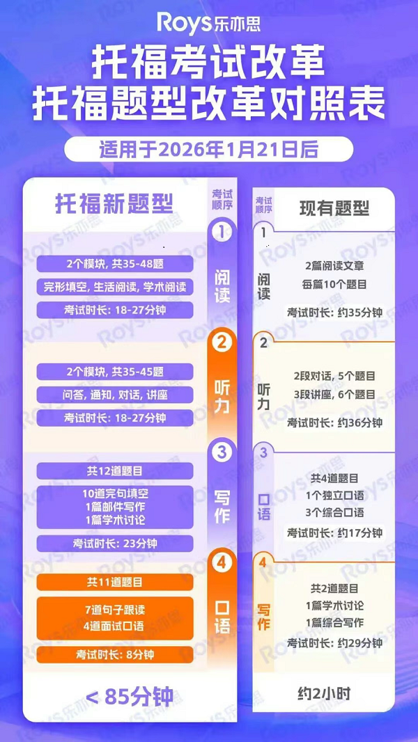 2026年的托??荚?,那可是要大變樣了!院校需要重新評(píng)估錄取成績(jī),考生們也得花點(diǎn)時(shí)間去準(zhǔn)備和適應(yīng)。老版托福和明年新版托福的對(duì)比圖,咱們也給大家準(zhǔn)備好了。
